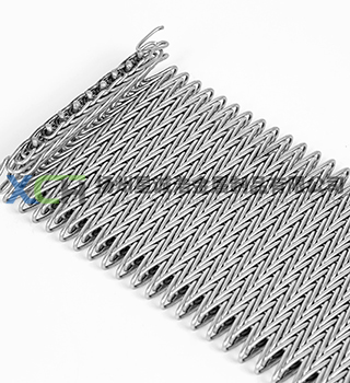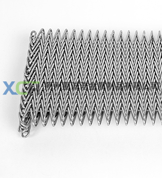 人字型網帶是雙旋網帶的一種變體,依次由左旋和右旋網條形成非常緊密和平整的網面,通常使用直軸但有些規格也可以使用曲軸。網條的緊密性使這種網帶很適合輸送小件產品,例如堅果、螺栓、螺釘、釘子、小甜餅、化工顆粒等。